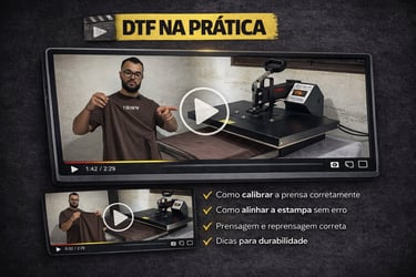 DTF na Prática é um mini treinamento em vídeo aulas diretas e objetivas, onde você aprende na prática como calibrar a prensa, alinhar corretamente a estampa, realizar a prensagem e a reprensagem do jeito certo, evitando os erros mais comuns que fazem o DTF descascar ou sair torto.